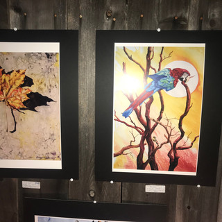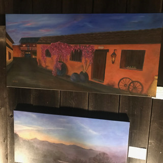 Silvia from Colombia could not deny her South American roots with her earthy warm colors and pueblo-like ranches & landscapes that invite you right in; on this chilly night I could feel the warm shimmering air of her landscapes surrounding me! Her traditional paintings were juxtaposed by her abstract pieces. Loved her surface-agitated abstract landscape as well as the vibrant bold-shaped one! I value Silvia's sincerity in her art that knows no pretense, and her modesty. It was her first public art show, yet her art is well rooted already.