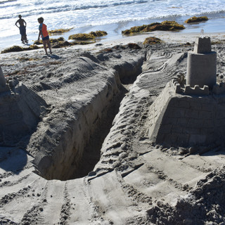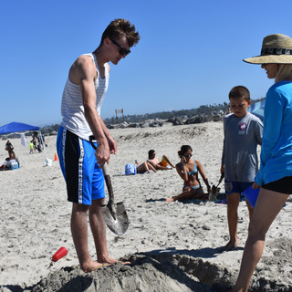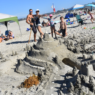 If you came on Sunday to the ocean toward our direction, the foreign large flag would be stuck on a high pole in the middle of a romantic sweeping Mission Beach, flapping in the air, visible from far away. It attracts onlookers to come closer, to start a conversation "what is this all about". People then observe with amusement and interest the busy beach! They watch almost forty active sculptors shoveling, ditching, digging, sculpting, watering huge piles, cementing them with mighty shovel-pounding into the desired shape and creating unique sand sculptures! Children and women keep running back and forth with the colorful buckets to the ocean for water, men, boys and girls alike are working steadily and swiftly with shovels and spades, molds and rakes, trying to outdo the neighbor who may be a friend, but today a fierce competitor!
